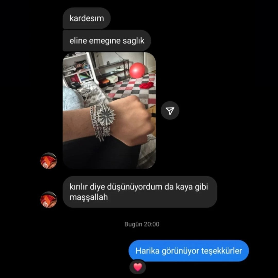 Zarif orantılar ve sade çizgiler, bilekte gündüzden geceye uyum sağlayan sofistike bir duruş sunar. Pürüzsüz geçişler ve dengeli parlaklık, minimal formu modern bir incelikle tamamlar. El lehimiyle özel işçilikle yapılmıştır.