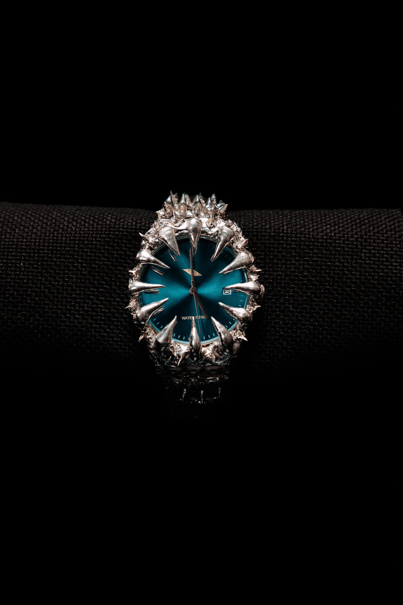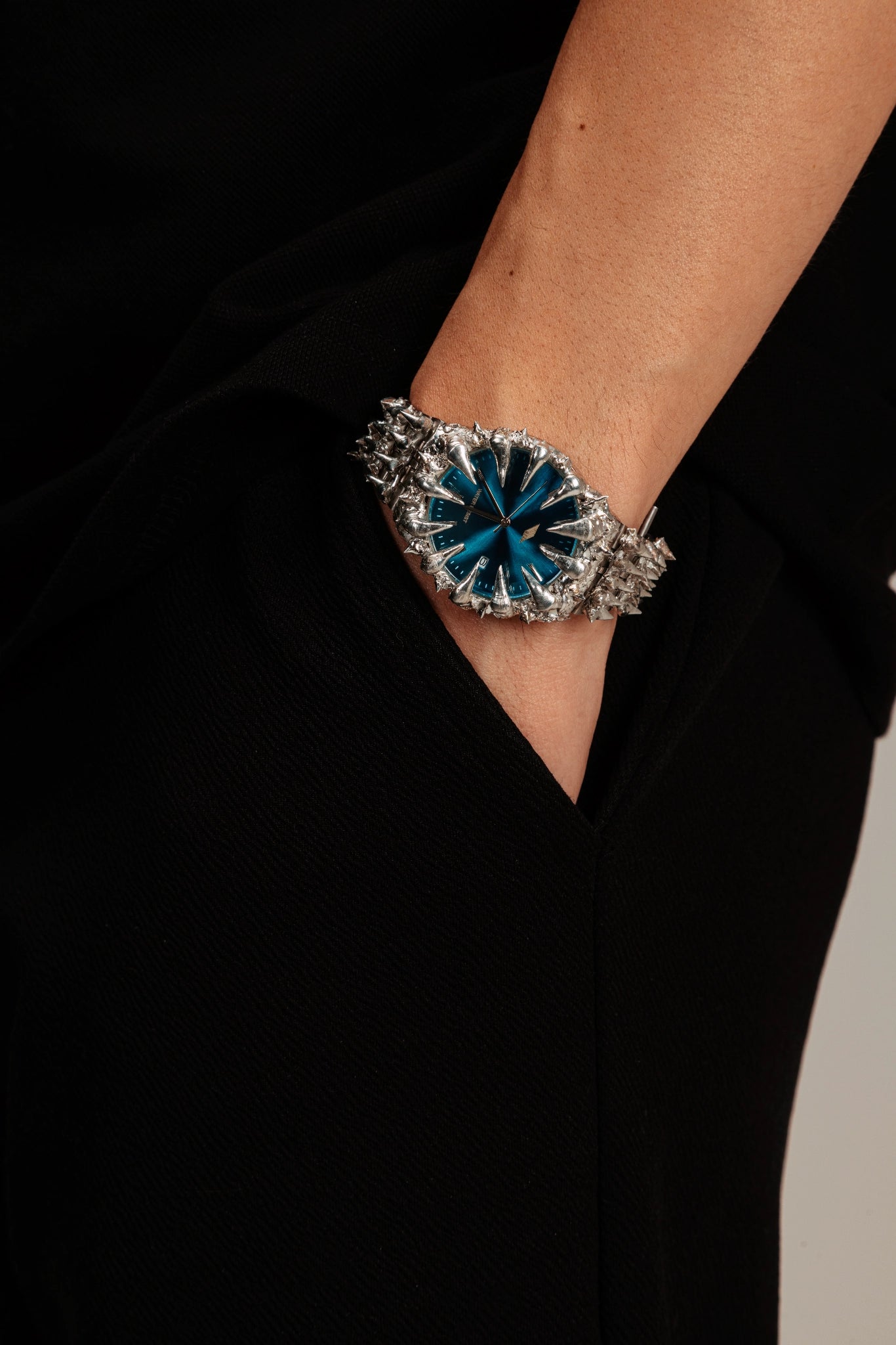 Serin mavi bir nota gibi titreşir; modern çizgileri bilekte zarif bir kıvrım yaratır, yumuşak parıltısı sakin bir özgüvenle görünümünüze ince bir imza atar. El lehimiyle özel işçilikle yapılmıştır.